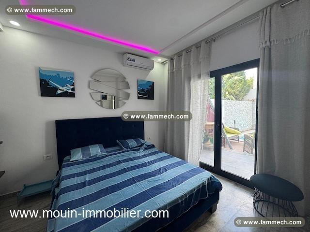 Il offre un salon, une cuisine équipée et aménagée d’un séchoir, une salle d’eau et deux chambre à coucher donnant sur la terrasse et piscine (72m2).
